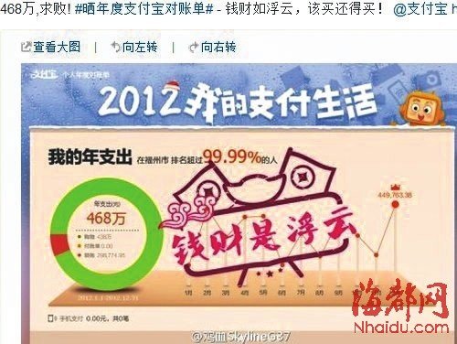N本报记者 王烽 本报讯 昨日,支付宝发布2012全民年度对账单。去年,福建地区的支付宝网上支出金额约占到全国的3.96%,排名全国第七多,同比上年增长了66.7%。 昨日,不少网友在网络上“晒”起自己的年度支付宝账单,其中最抓人眼球的“支付帝”来自福州,该网友的年支出达到了468万元,光在天猫、淘宝网购物就花去了438万,日均花费超过1.2万元。 人均15783元 莆田人均支出领衔全省 支付宝方面的数据显示,从地区来看,2012年,江浙沪以及北京、广东、福建等东部省市依然是网上消费的主力军。浙江用户的网上支出总额占全国总量的14.85%,以微弱优势超过广东的14.06%,成为网上消费最大的省份。上海、北京、江苏、山东、福建分列3到7位。其中,福建地区的支付宝网上支出金额占全国的3.96%。其中,福州市支付宝用户,人均支出10880元(其中购物支出7889元)。莆田和厦门分别以人均支出15783元和13871元位居我省前两位。 爱代付 福建人全国第五“豪爽” 在“代付”方面,浙江人最“豪爽仗义”,每10个人当中就有1人曾经为他人代付,在榜单中排名第一。排名第二、三的是上海和广东,福建人对朋友也毫不含糊,居第五,人均为别人代付的金额达到了3020元。 消费能力 1个“60前”抵8个“90后” 2012年,80后的支付宝支出占到所有支出约50%,是网上消费绝对的中坚力量。不过要论消费能力,80后要让位给70后、60后乃至60前的前辈们。60前的人均网上支付金额最高,达3.1万元,其中人均购物金额就达到1.5万元。最低的是90后,人均支出金额是3962元,人均购物金额只有3112元。一个60前的支出抵得上8个90后。 从支付宝的年度对账单里甚至还能看出哪个城市的男人最疼女人。数据显示,最爱女人的不是上海这样细腻的东部城市,而是传统印象中更粗线条的新疆人,过去一年新疆图木舒克市的男人为女士购买的商品最多,而为男士购买商品最多的女人则分布在台湾嘉义市。【晒账单】 “钱财是浮云”一年支出468万元 昨日,许多网友在微博上晒起自己的年度支付宝对账单。福州一个名为“鸡血Sky lineG37”的网友喊出了“钱财如浮云,该买还得买”的口号。根据晒出的账单,其支付宝年支出达到468万元,光购物就花去了438万,他的年支出在福州市排名超过99.99%的人。单月最大笔支出在去年12月,为44.97万元。 这条账单微博,短短几小时转发量就超过了500,或许是围观的网友太多,这条微博于昨日中午时分即被删除。该名网友随后补发了一条微博称,“呃,那啥,其实我只是比较爱买切糕罢了。”他回复别的网友评论称,“不想出名而已啦,大家笑一笑开心一下就行了。”相比之下,同在微博上晒出的在上海排名超过99.9%的人年支出65.64万元,简直弱爆了。 支付宝相关人士昨日接受记者采访时表示,账单是不会有假的,因为数据都是根据支付宝后台实际交易数据生成的,网购支出金额高,可能有多种原因造成:当前支付宝也支持譬如部分店家诸如钻石、商品房等大额物件的支付;还有一种可能是,这个用户他本身是一个通过网购搞批发商品,做生意的。 记者尝试与该网友联系采访,但未果。记者浏览其微博,看得出来,其生活富庶,玩车玩表玩相机。