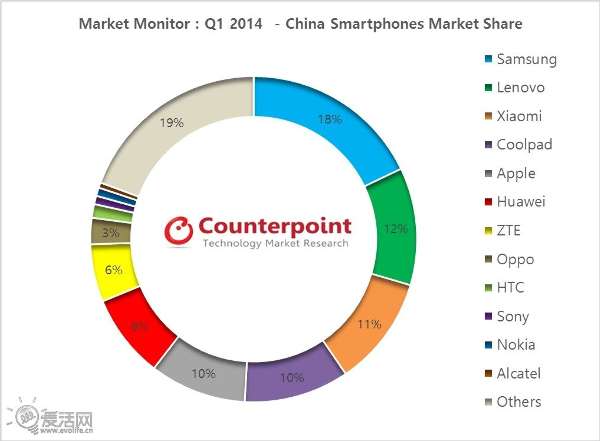 根据市场研究机构Counterpoint的调查显示,小米在中国的市占率继续领先苹果。小米的中国市占率领先苹果的调查数据最早出现于去年8月,最终调查结果震撼了老外,几乎所有外媒都报道了这一消息,当时甚至让苹果总部都感到吃惊。 根据最新的调查报告,在2014年第一季度,小米在国内的市占率为11%,而苹果只有10%。中国智能手机的市占率前5名分别是三星18%,联想12%,小米11%,酷派10%以及苹果10%。不过,随着移动版iPhone 5s的上市,这个排名已经有所改变——苹果难得保持了一个上升势头。 中国是世界上最大的智能手机市场,并且正在日益受到重视。不过由于中国消费者习惯购买低价手机,因此有不少厂商都陷入了价格战的泥潭,只有很少厂商能从这个大市场中获取到足够的利润。虽然对于消费者来说越来越低的手机价钱是一件好事,但是如果厂商只能采取拼价格的方式来进行竞争,这对于整个行业来说必然不是个好消息。