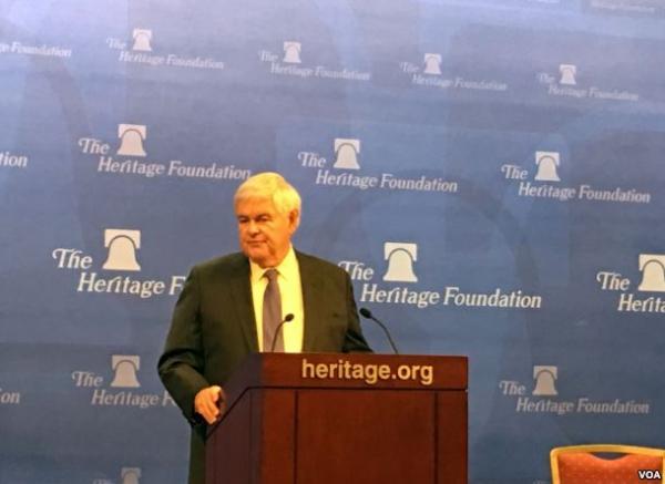 美国前议长纽特·金里奇星期二(12月13日)在华盛顿传统基金会发表演讲。