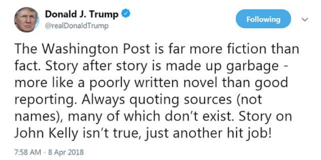当然,特朗普本人是不承认这些情况的,甚至他还给同样报道了约翰·凯利要辞职的《华盛顿邮报》扣上了“假新闻”的帽子。