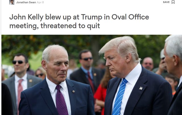 这不,Axios在另一篇报道中就继续爆料说,特朗普的白宫幕僚长、退役四星上将约翰·凯利已经在过去几个月里多次威胁特朗普他要辞职,因为实在受不了特朗普一些做法。