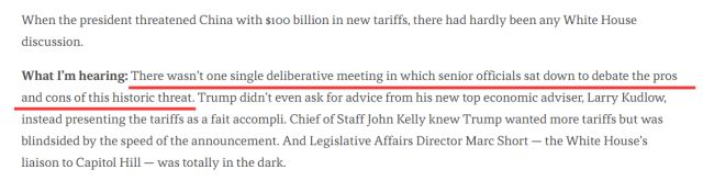 这其中就包括特朗普这次威胁要再对中国1000亿的商品加征关税的事情。这位白宫幕僚长在特朗普对外宣布这一决定之前居然根本没听说过这件事……