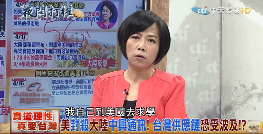 【环球网综合报道】中美贸易战打响后,美国商务部又将一记重拳向中兴通讯砸下:由于中兴通讯违反了曾与美国政府达成的和解协议,7年内禁止美国企业向中兴通讯出口任何技术、产品…… 就在大陆网友热议美国为何出如此狠招制裁中企时,消息也传到了海峡对岸的台湾。19日,台湾政论节目“夜问打权”的主持人黄智贤在节目中给出了自己的看法↓ “美国真正的理由,是要压制中国大陆的崛起,在科技,在金融,在贸易,在每一块方方面面都要打击你,我绝对不让你站起来”。 节目中,各位嘉宾也对黄智贤的看法做了论述: 节目嘉宾、国民党“立委”费鸿泰:目前,世界上只有美国、台湾和印度不买中兴通讯交换机,台湾是听美国话的,美国给台湾所谓的理由是,怕大陆植入木马程序,这也是美国一直不想让大陆的通讯设备进入美国的原因。 现在美国跟中国大陆都在抢5G的主导权,都在定规格。中国大陆在2025年的时候,我要做中国制造,就是世界制造的头。如果它确实做到了的话,美国的资通讯厂商大概就没有存活的空间了,或者跟中国大陆变成很悬殊了。所以,这个时候打贸易战,(美国)是为了日后5G的市场。 台湾辅仁大学前新闻系主任习贤德:7年,这么狠,摆明了就要要滞后中国大陆在这方面技术的取得跟成熟,甚至超越。美国今天犯的错误,不但跟世界贸易组织的开放市场观念悖反,根本就是它不敢,不甘让出领先的地位,真正答案在这里。 台资深媒体人嘉宾张友骅:美国现在一而再、再而三地去阻挠中国,表面是经济原因跟国家安全原因,实际上,如果5G的主导权在中国大陆手上的话,那美国势必会沦为二流国家,而不能够对中国大陆颐指气使。 但台湾是否会受中美贸易战的波及? 黄智贤首先认为:美国现在不计一切,它要压制大陆的发展,而台湾也要为了要拍美国的马屁,为了要争取美国的认同,也要加入去打击中国大陆吗?可是,台湾自己会不会被打击了呢?你以为你站在旁边是看两边打架吗?不,美国打击大陆的电信业,直接冲击的是台湾第一线,台湾最好的几家科技大厂。 台北市议员王鸿薇:中美贸易大战,绝对不像美国所讲贸易逆差那么简单的问题。美国不仅制裁中兴,还对华为、阿里巴巴制造市场障碍。中美贸易战下来,你要知道,台湾的产业会受伤多少。未来,如果中兴在美国受阻的话,对于台湾的厂商影响会是什么?对台湾鸿海、台积电的影响会有多大?! 不要每天在美国旁边做他们的小弟,我们要问自己,我们到底得到了什么?失去了什么? 费鸿泰:台湾帮中兴和华为做了很多代工,马上受到影响的就是台积电。对台湾来说,最好还是不要去瞎搅和。 说了这么多,台湾显然在嘉宾眼中是“吃不了兜着走”的角色…… 最后,黄智贤用自己的亲身经历说道: 台湾人,你看清楚了吗?我们在台湾的人,每一个人先天上都很亲美,都很习惯美国的价值跟文化,都会觉得,对美国好的,就是对人类好,美国说的就是对的。我自己到美国去求学,我当然知道美式的价值,可是你看到的每一件事情,很清楚,两个国家要争取生存,美国站在美国的立场,我当然要把你中国打到趴在地上,我吃饱,我还要吃好,我哪容你喝一口汤?中国大陆就趴在地上给你打吗?中国大陆不能够爬起来吗?中国大陆已经崛起,正要崛起,更要崛起,美国当然很惊慌,台湾该怎么办?(答:台湾有中国,台湾属于中国,欺负台湾就等于欺负中国)