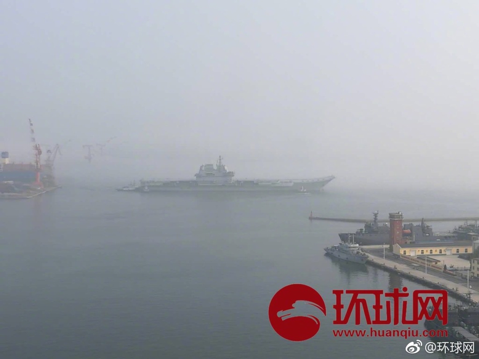 6时45分,国产航母离开码头! 6点53分,国产航母再次鸣笛。 7点14分,国产航母调头完成,出港! 7时23分,国产航母逐渐消失在外海方向的雾中。