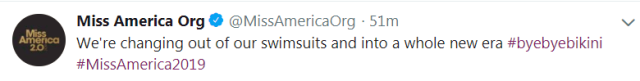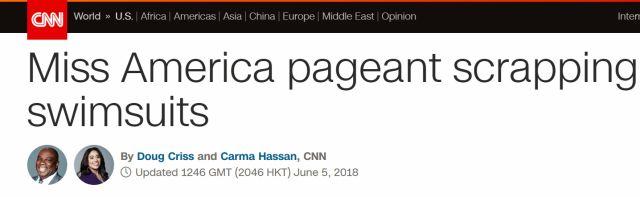 美国有线电视新闻网(CNN)当地时间5日报道,据赛事组委会消息,下一届美国小姐选美大赛将“报废”比基尼泳装,不会再出现泳装展示环节。 ▲CNN报道原文截图 据报道,美国小姐赛事组委会于当地时间周二宣布,下一届美国小姐选美大赛将取消泳装展示,并将对各种身材尺寸的女性更具包容性。 美国小姐董事会主席格雷琴⋅卡尔森(GretchenCarlson)在“早安美国”节目中宣布,这项活动将不再以泳装比赛为主题。卡尔森周二在节目中表示,之后的美国小姐选拔将是一场实实在在的“比赛”而不再把重点放在“选美”上。她称:“我们不会再以候选人的外表来评判他们。这是一种巨大的改变“。 ▲代表田纳西州参赛的凯蒂⋅戴维斯身着泳衣参加2018年美国小姐泳装挑战赛 此外,美国小姐赛事还在其官方推特账号上发布了一段简短的视频,视频中出现的一套白色比基尼逐渐冒出浓烟消失不见,最后出现的画面上写着#byebyebikini(再见比基尼)的话题标签。