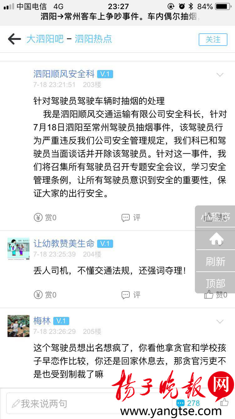 7月19日讯(记者 高峰)大家都知道,大巴车是公共场所,车内也贴着“禁止吸烟”的字样,驾驶员本该带头遵守。但泗阳一个大巴车司机一段“理直气壮”的言辞,让他火了起来,在抽烟遭到一年轻小伙制止后,他怒了,拍摄了一段视频,对小伙子进行训斥和声讨,并将视频发到网上,这段视频引起众多网友议论和转发。7月19日上午,扬子晚报记者从泗阳顺风交通运输有限公司了解到,目前该驾驶员已被作出停班处理,并进行安全教育,等交通部门、公安部门联合调查后再作进一步处理。 驾驶员右手中夹着香烟 这段视频时长3分26秒,可以看出视频应为大巴车驾驶员所拍,从一开头,大巴车驾驶员的语气就异常激动而高昂:“是你跑我前面的?我现在和你解释一下,驾驶员偶尔抽根烟….”这时,对面的小伙子辩解了一下,驾驶员陡然提高了声音,“全国的广大货运、客运兄弟们,我是江苏泗阳县人氏,我是开大巴的驾驶员,我们驾驶员是保证乘客安全、准时准点到达目的地,偶尔困倦的时候抽根香烟。这位帅哥拿着鸡毛当令箭,不顾大家的安全,跑到前面影响我驾车,拿手机来拍摄我。我问一下,驾驶员偶尔抽一次烟,犯不犯死罪?我问你,犯不犯死罪?” 这时,小伙子分辩说:“那你上面贴着‘禁止吸烟’,是玩的吗?”驾驶员开始举贪官和学生校内早恋的例子来反驳小伙子的观点,“那我问你,你在学校谈没谈过恋爱。”“两码事!”小伙子插了一句,并称驾驶员是抬杠。驾驶员继续追问,并对小伙子进行声讨,“你解释一下,校有校规,家有家规。社会上有你这样的人,就没有一点人情味。” “那我让你把烟熄了,你睬都不睬我!”小伙子弱弱插了一句。“我开车我再回头和你讲话啊?一车乘客的安全,我顾不顾啊?要给你,你会把方向盘撂了,回头和我讲话啊?” 记者注意到,视频镜头大部分是对着一个年轻的戴眼镜小伙子,偶尔扫过车内乘客,车内乘客不多,但大多抱着观望的态度。视频的最后,可能为了为了缓和一下双方紧张的气氛,一位乘客劝说道:“小伙子,不要太较真啊!”驾驶员最后一再强调,自己没有时间在车下抽烟,不睬小伙子,是为了全车乘客的安全。 视频流出后,在当地网上热传也引发了众多网友热议。“我也非常不喜欢别人在公共场所抽烟,别提边开车边抽烟了,对自己不负责更是对车上几十口家庭不负责任,关键知错不改还理直气壮的叫嚣,想想过几天坐大巴回家的我默默地倒吸一口凉气。”一位网友评论说。 一位知情的网友跟帖说,“视频是司机拍的发到他所在的‘全国客运货运司机群’,然后视频流出了。是他自己把人怼的说不了话,觉得自己多牛,然后害了自己。真是NO ZUO NO DIE!” 视频中的小伙子也很快在网上出现,跟帖称,“我是这个小伙子,有什么联系我,此人毁我形象,明天我只好去泗阳顺风投诉。我在这里说我只想让大巴司机驾驶员对我道歉,现在他毁我形象,给我造成了生活不便。”随后,他在跟帖中贴出了驾驶员的照片和车牌照。 很快,一位在网友跟帖中贴出了《针对驾驶员驾驶车辆时抽烟的处理》:“我是泗阳顺风交通运输有限公司安全科长,针对7月18日泗阳至常州驾驶员抽烟事件,该驾驶员行为严重违反我们公司安全管理规定,我们科已和驾驶员当面谈话并开除该驾驶员。针对这一事件,我们将召集所有驾驶员召开专题安全会议,学习安全管理条例,让所有驾驶员意识到安全的重要性,保证大家的出行安全。” 7月19日上午,扬子晚报记者联系上了泗阳顺风交通运输有限公司安全科田科长。田科长称,网上的内容是他所发,“目前,我们已经对驾驶员作了停班处理,并进行安全教育,肯定是要开除的。下面交通、公安部门调查后将作进一步处理。”记者了解到,泗阳警方对此事也介入调查。
