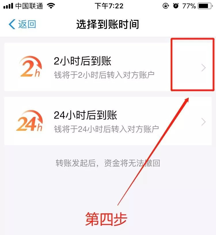 最后一步,选择到账时间“实时到账”、“2小时到账”或“24小时到账”