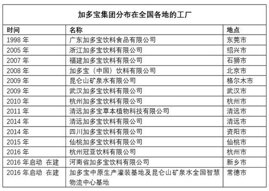 尽管曾被曝光停产和裁员,加多宝近年来仍然热衷于扩建工厂。一位加多宝的项目副总监告诉网易清流工作室,目前加多宝在全国共有12个注册公司和产业园区建成,广东省3个,浙江省3个,湖北省两个,北京、四川省、青海省和福建省则各一个。根据网易清流工作室不完全统计,加多宝在全国共有14间工厂。相比之下,王老吉在全国不过有4个生产基地。