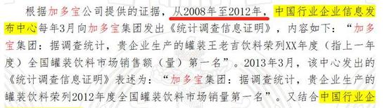 2016年起,加多宝在涉及广告语的数宗诉讼案件中,还多次提交数份关于中国行业企业信息发布中心的报告或证明。根据网易清流工作室查阅的判决书显示,2008年到2012年,中国行业企业信息发布中心每年会向加多宝发送调查数据。