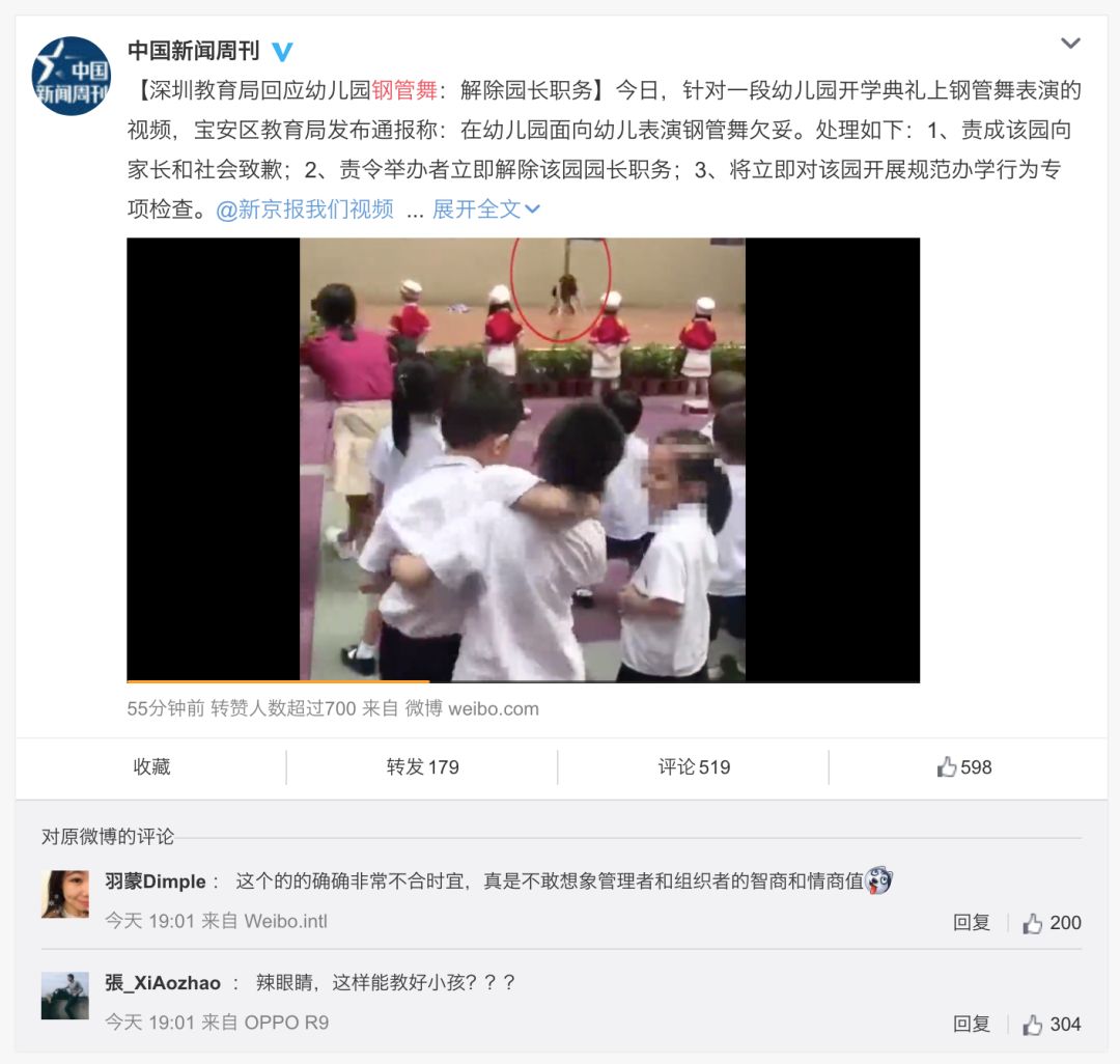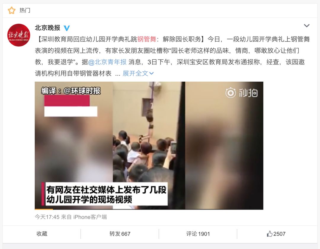 但是到了下午,画风突然不对了, 爸妈营被朋友圈刷屏了, 深圳某幼儿园的开学典礼, 竟然表演钢管舞???