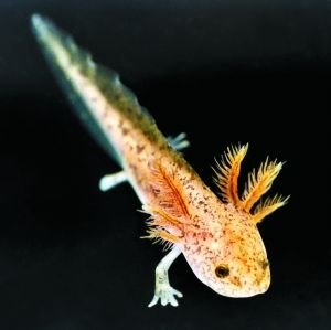 早春时节,当水温回升到18度时,成年六角恐龙开始配对,雌性将一串串卵产在水草和石块上。它们一次可以产下200~400枚卵。黑色的小圆点就是卵内的胚胎,外层透明的物质是胶质膜,可以把卵牢牢地黏在水草上,防止被水冲走。水中孵化15天左右,卵泡里的小六角恐龙已经清晰可辨,它们瞪着大眼睛环视着外面的世界。与蝌蚪变青蛙的变态过程不一样,六角恐龙的发育方式比较特别,幼体一出生就有“六角”,先后长出前后腿,长相与成年个体没有太大差异。换句话说,无论年龄大小,它们终生都保持着幼体的形态,生物学上称之为“幼态成熟”。