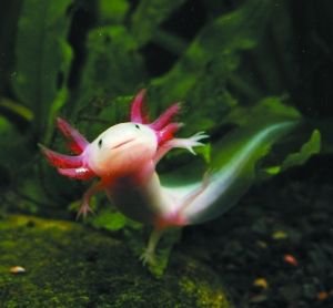 6虽然个子小,捕起鱼来却很猛哦 人们早在100多年前就开始饲养六角恐龙,用于实验和研究。如今在我国各大城市的宠物市场上,也能见其身影。人工饲养条件下,在野外难以存活的变异个体都活了下来,逐渐培育出白色、金色等品种。虽然颜色改变,但是它们的习性和野生的没有太多不同,依然是“游泳健将”:收起腮以减少阻力,四肢向后一蹬便能快速游走,宽大的尾部能像舵一样掌握方向,很是灵活。
